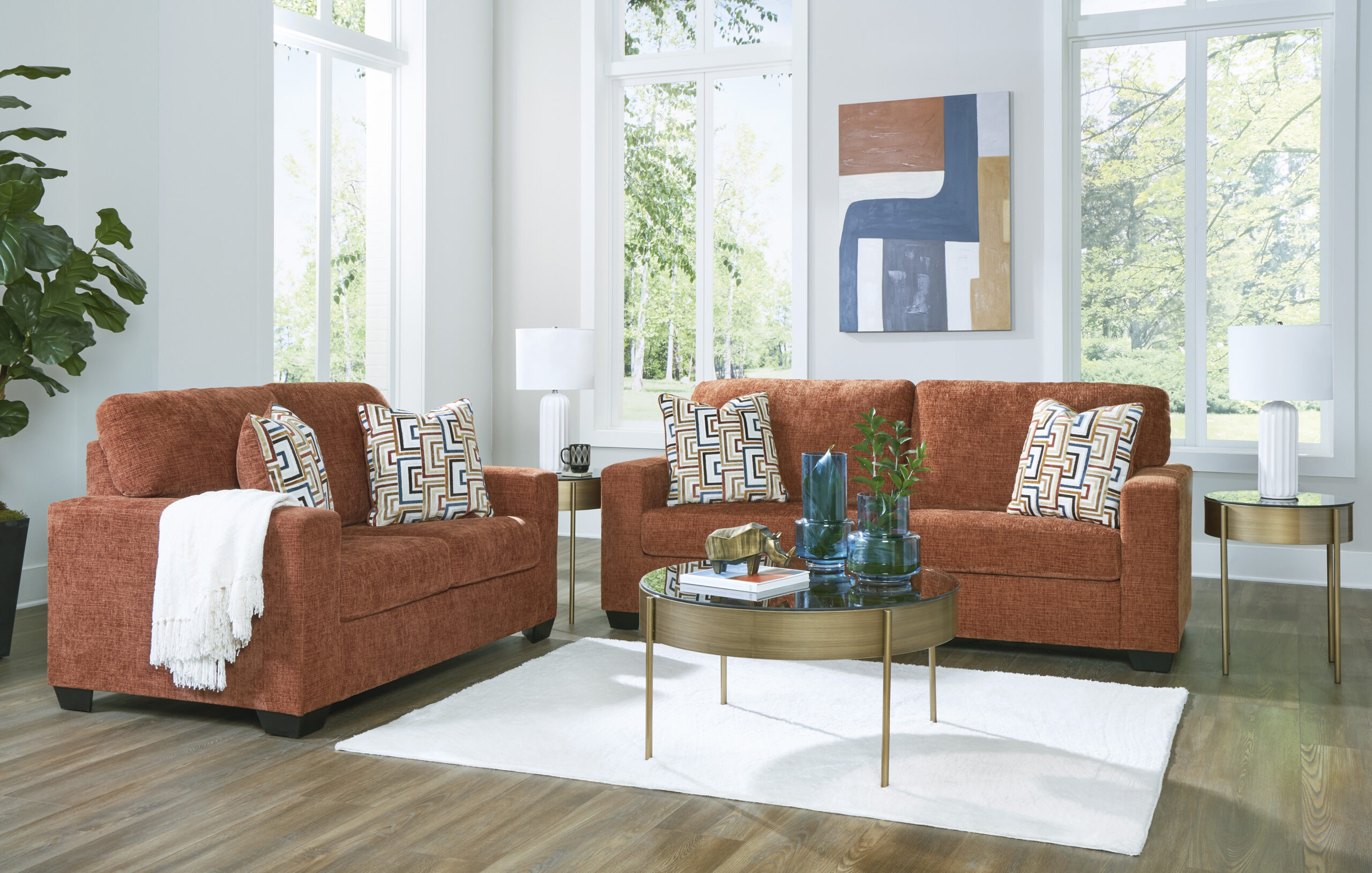 ¿Buscas hacer una declaración audaz con color? Dale vida a tu sala con esta colección. Su tapicería naranja quemado, de tendencia, añade un divertido toque de color a tu decoración. Almohadas decorativas atrevidas y eclécticas completan el look.