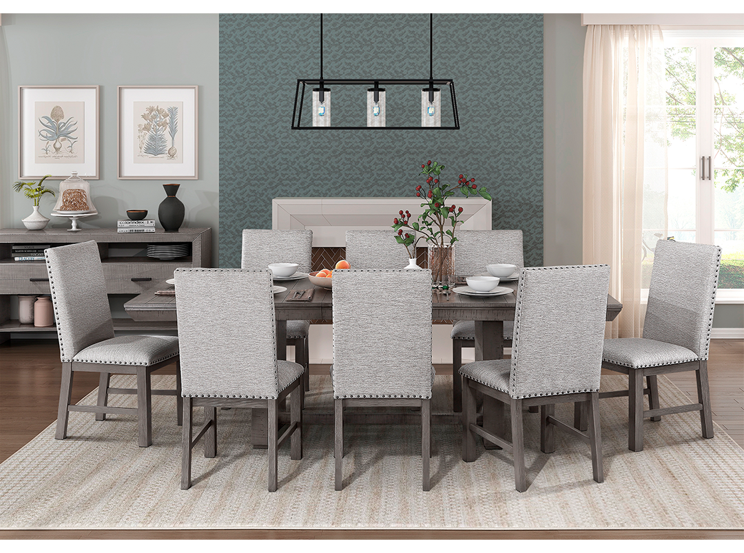 En una ruptura con el estilo minimalista del diseño contemporáneo, la colección Brookings ofrece una plataforma sustancial para el placer de comer. La chapa de acacia de la colección se trata con un acabado marrón, su tono es una adición neutral a su espacio. Un pedestal rectangular con marco de caja abierta sostiene la mesa. Las sillas laterales de la colección cuentan con asientos de tela gris texturizada con un riel superior de madera y respaldos cosidos en forma de abanico. Un servidor que lo acompaña proporciona un amplio espacio de almacenamiento detrás de la puerta para la ropa de cama y la decoración de la mesa.