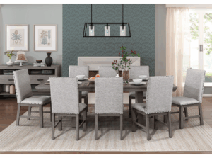 En la intersección del diseño moderno y rústico, la Colección Gresham lo lleva a una parada completa. Las líneas limpias se combinan con la belleza natural de la chapa de acacia, mientras que un acabado gris brinda una versatilidad neutra a la decoración de su comedor informal. El aspecto rústico de la mesa de tablones se ve interrumpido por las líneas modernas del borde en ángulo del delantal de la mesa. Las sillas laterales a juego cuentan con patas de madera y asientos tapizados en tela gris, con molduras de cabeza de clavo que definen el perfil. La estantería de exhibición abierta del servidor se presta aún más a la apariencia moderna de la colección al tiempo que proporciona almacenamiento en cajones para la decoración de su mesa.