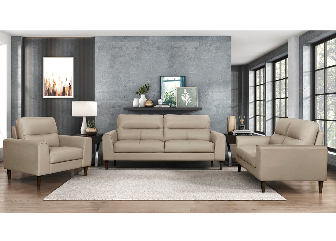 Esta sala tiene algo especial que es fácil de apreciar. Tal vez sea su lujosa tapicería en tonos relajantes, que invita a la máxima comodidad, o su diseño moderno con líneas limpias, patas estilizadas y cojines con patrones abstractos. Sea lo que sea, es una sala que hará que te enamores de tu espacio una y otra vez.