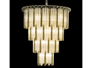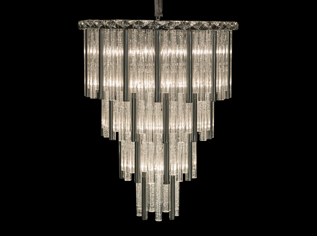 Esta lámpara en cascada está revestida de vidrio transparente y campanas en dorado, ofreciendo un brillo suave y uniforme. Coronada con un anillo de cristal, Chimes es la creación perfecta del lujo moderno.