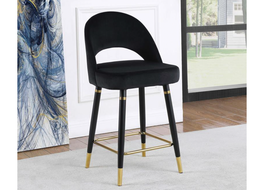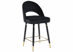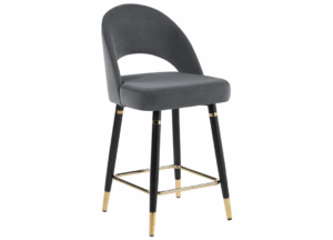Banco Lindsey, es una cómoda y elegante silla, su respaldo curvo le da una especial comodidad a su espalda. Tapizada en fino terciopelo en colores gris y negro. Las patas Terminadas con un capuchón de bronce le dan elegancia y protección al diseño.