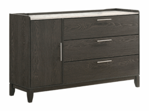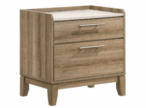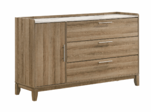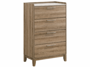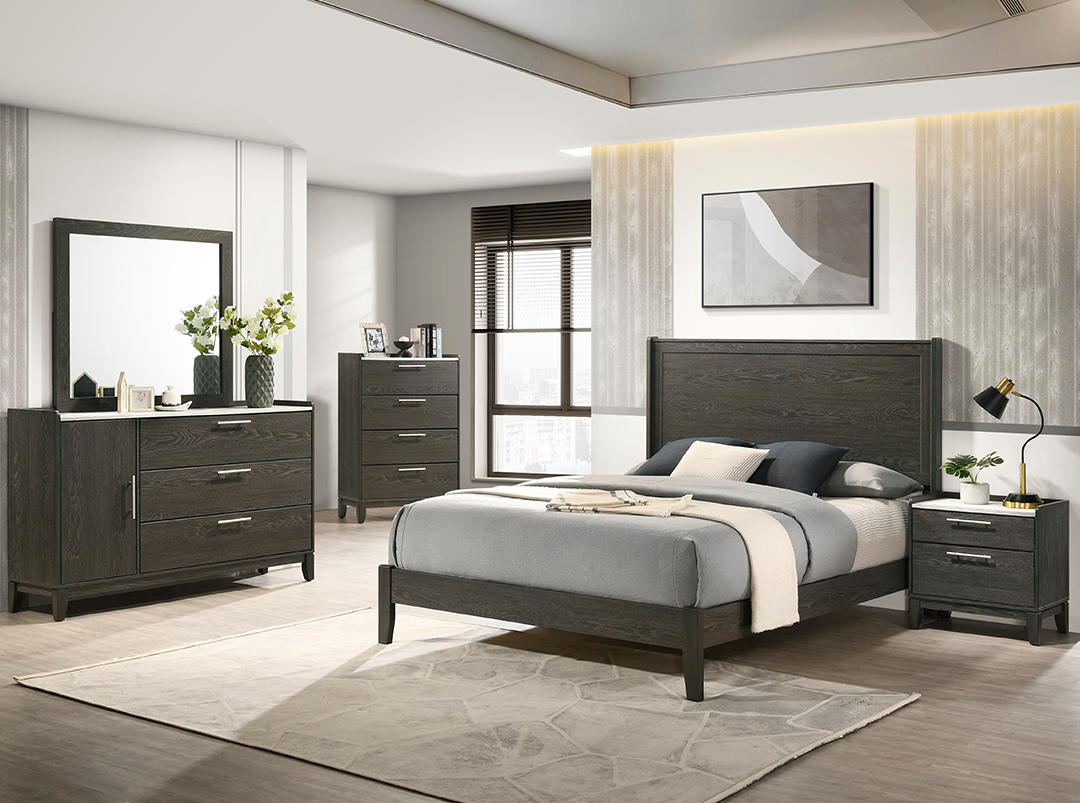 Con un diseño elegante y funcional, esta recámara ofrece una estética contemporánea con toques minimalistas que se adaptan a cualquier ambiente moderno. Su acabado tipo madera oscura aporta calidez y sofisticación, mientras que las líneas rectas y los detalles metálicos en las jaladeras realzan su estilo limpio y actual.