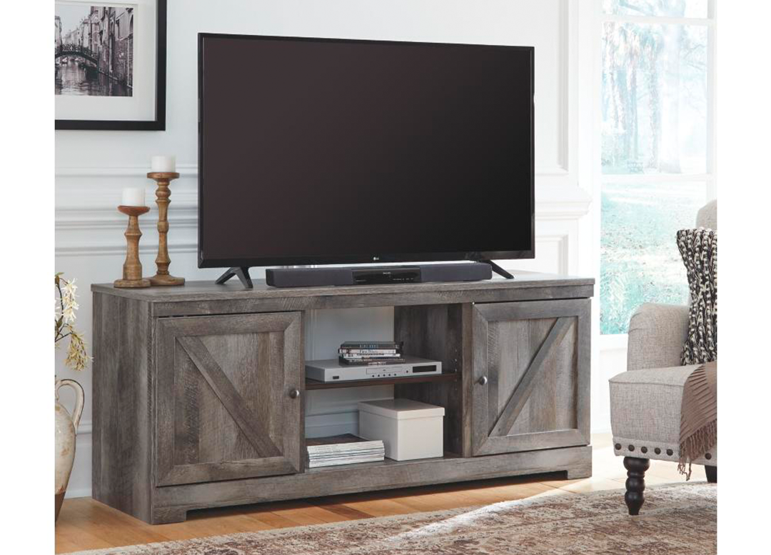 Refresque su espacio de entretenimiento con las líneas limpias de la Consola de TV. La consola se encuentra cerca del suelo sobre una base de metal. Con dos cajones y tres estantes, hay mucho espacio para almacenar películas, juegos y dispositivos electrónicos. El soporte sostiene un televisor de hasta 46 “.