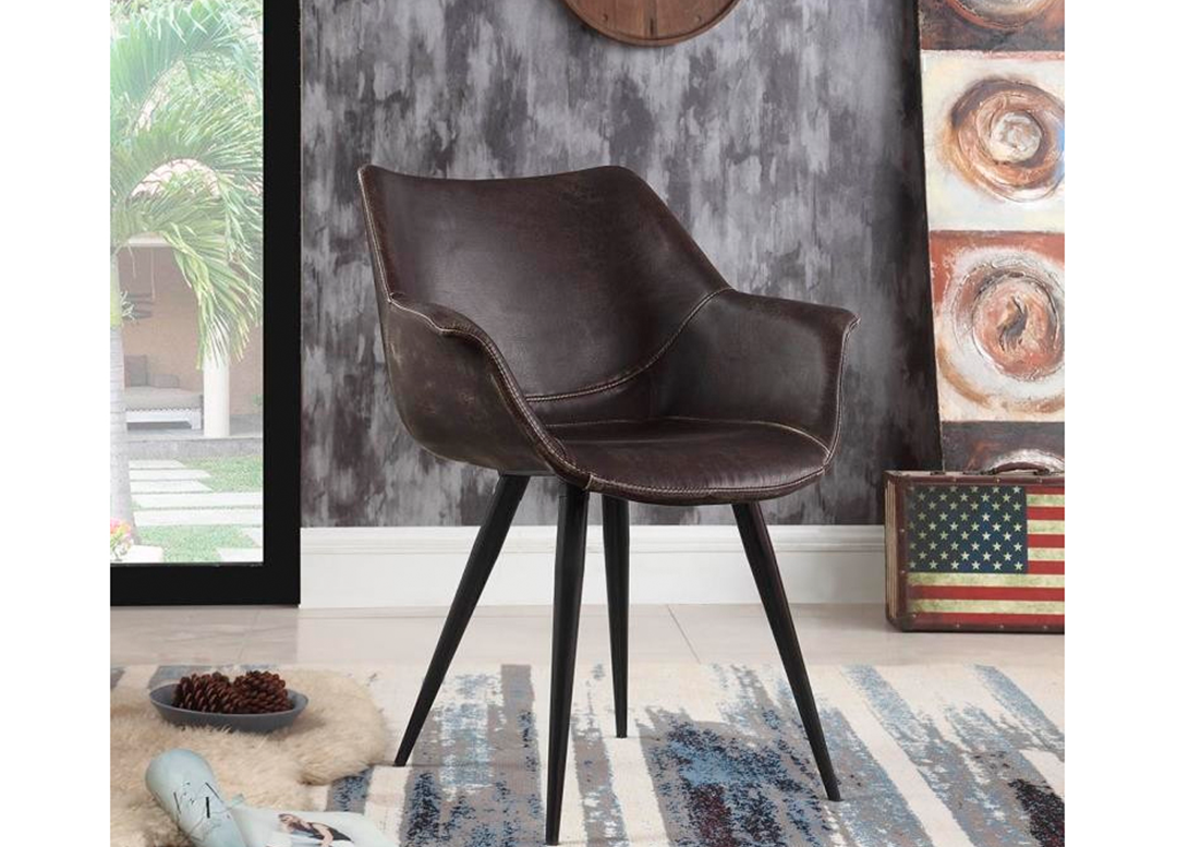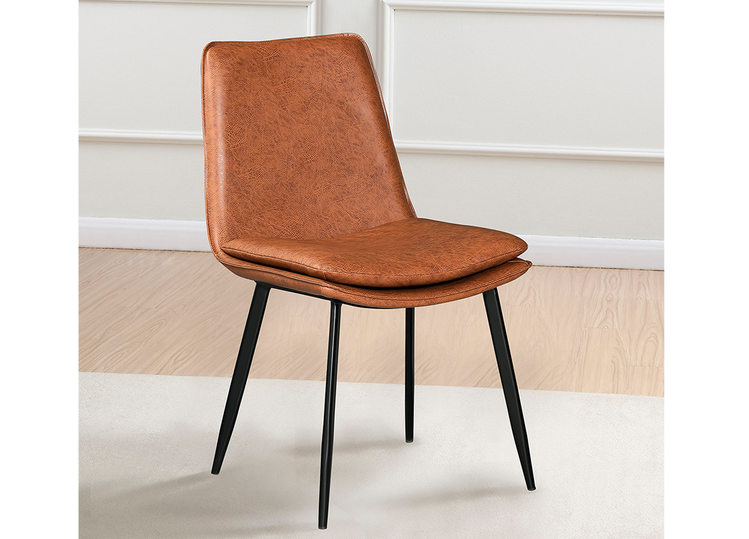 Una silla de cuero sintético inspirada en mediados de siglo con detalles de costuras, patas de metal acampanadas y un asiento en forma de copa. Esta silla elegante y con estilo es una gran adición a su experiencia y se puede combinar con la mayoría de las mesas rectangulares o redondas por igual.