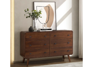 Para una decoración moderna, la Recamara Robyn le proporciona un diseño limpio y fácil de combinar! Construida en madera solida de álamo, terminada en café nogal oscuro, tiene deslizadores de extensión en metal en los cajones, cabecera tapizada en chenille gris oscuro. Es una recamara con novedoso diseño.