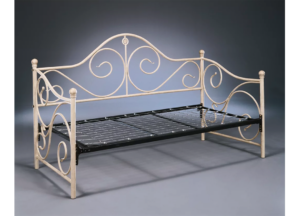 Con elegante estructura metálica en acabado color marfil y delicados detalles curvos que aportan un toque clásico y sofisticado. Perfecta para recámara o sala de estar, ideal para descansar de día y recibir visitas con estilo.